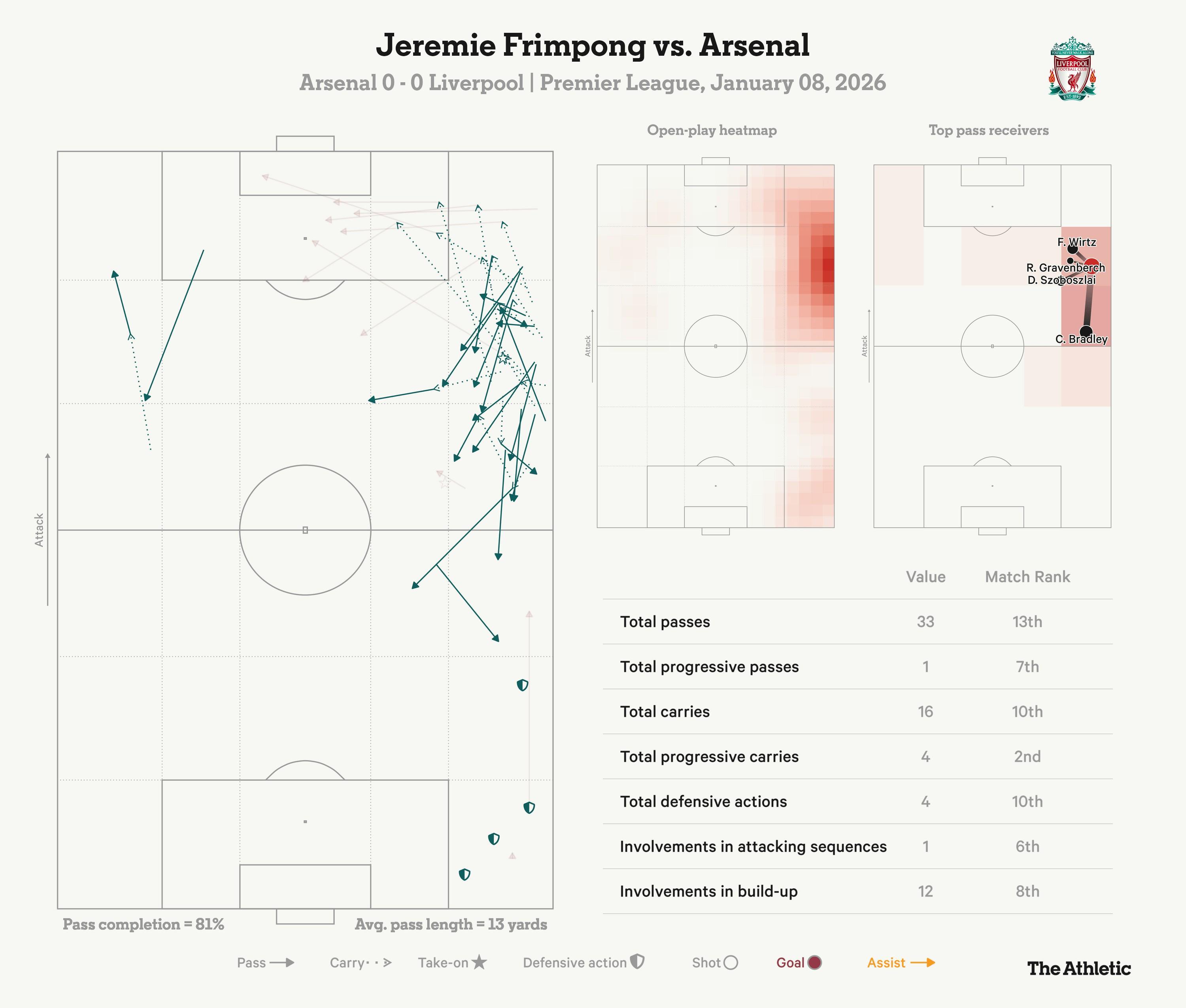 周四晚,他是利物浦的出球点并有效利用了速度。他的一次跑动几乎导致萨利巴与拉亚配合失误,最终造成布拉德利击中横梁。他下面的球员活动热图显示了其极高的站位。