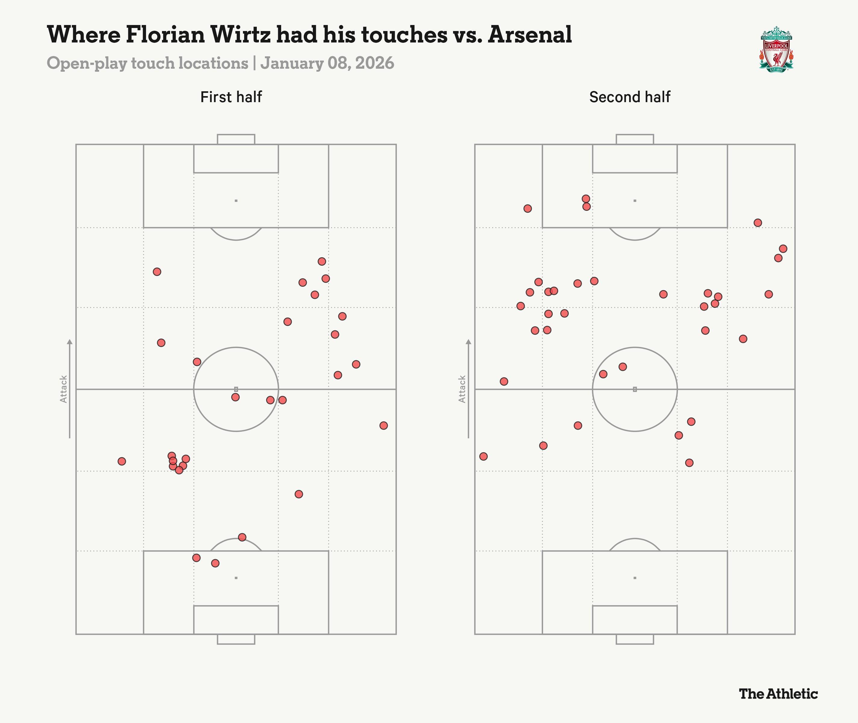 25分钟后,利物浦形势严峻,难以摆脱阿森纳的持续压制。他们以弗洛里安-维尔茨出任伪九号(触球热图如下所示),辅以弗林蓬和加克波的两翼,缺乏明确的出球点来缓解压力。