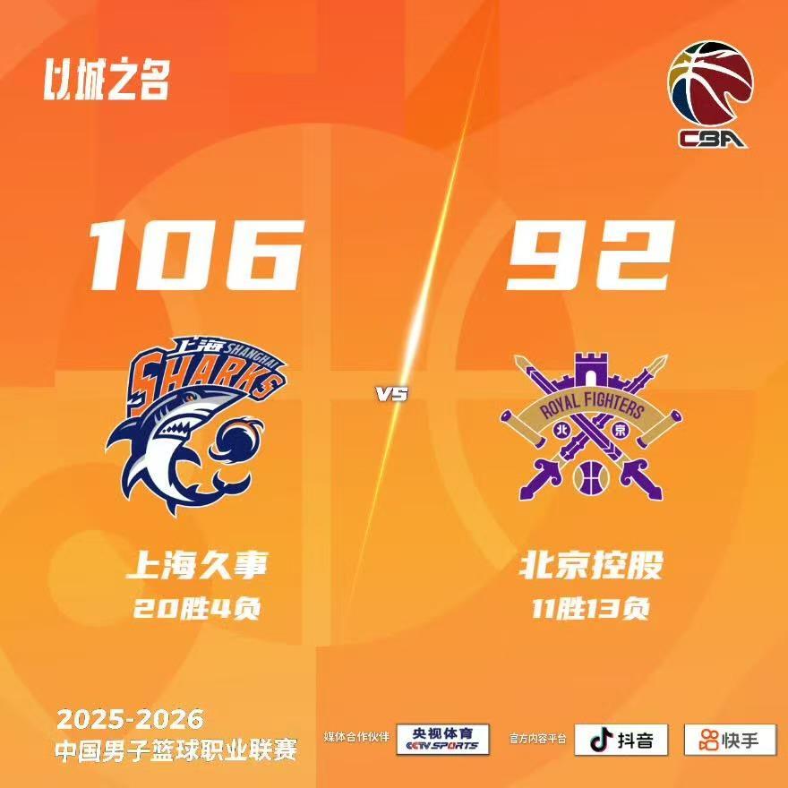 北京时间3月11日晚间,CBA常规赛第24轮,上海久事男篮主场对阵北控男篮。最终,大鲨鱼在经历短暂低迷后,重新找回手感,106比92战胜北控队,豪取常规赛五连胜!